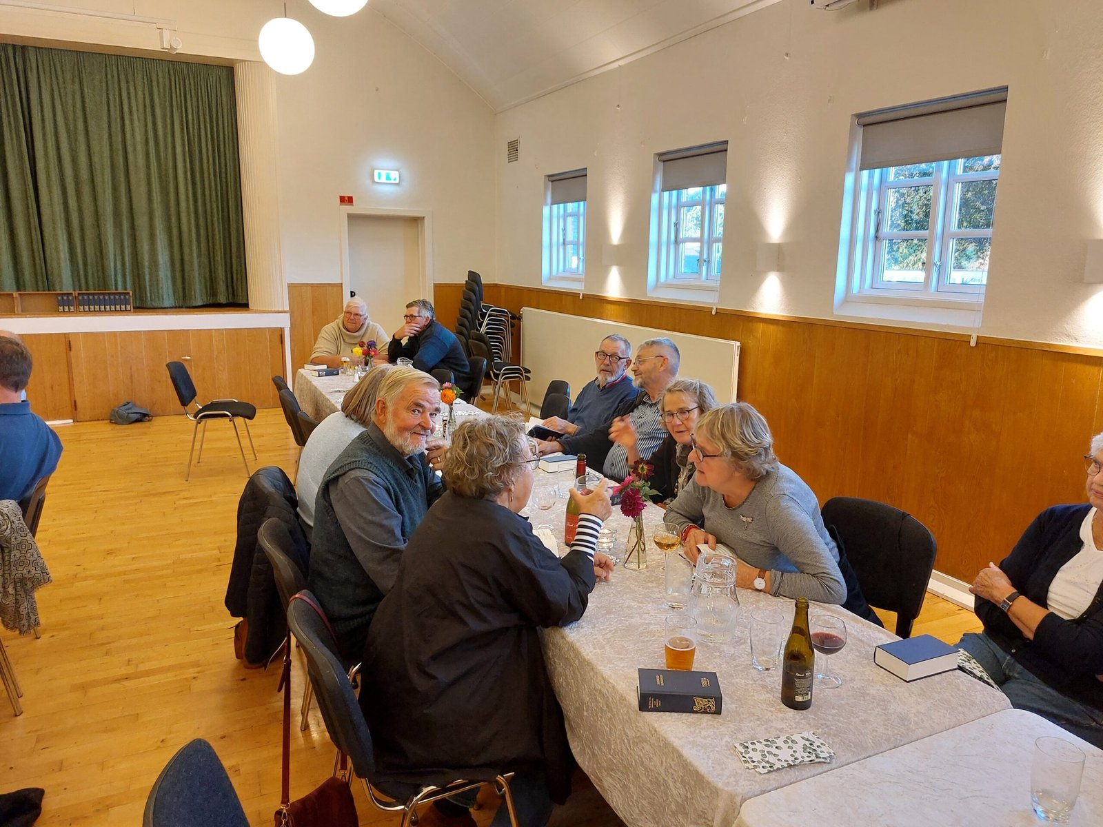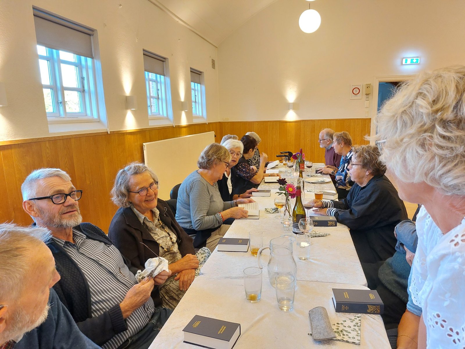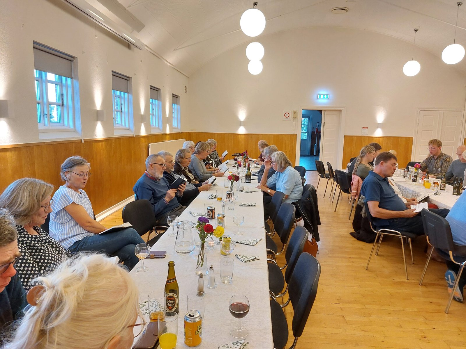 Sæsonens første fællesspisning i Tårup Forsamlingshus bød på andet end familierne Eriksen og Bildes gode mad. Vi indviede nemlig også de nye Højskolesangbøger – og blev ført sikkert gennem adskillige sange af Sognepræst André Friis Møller.