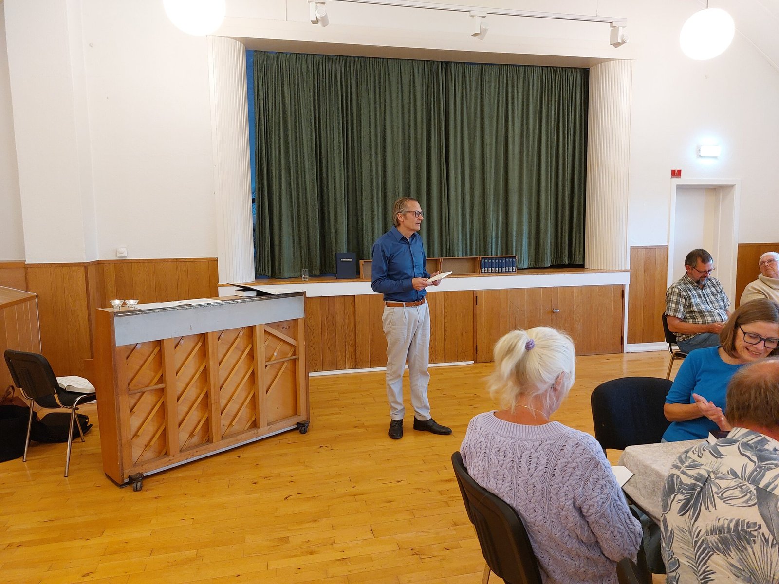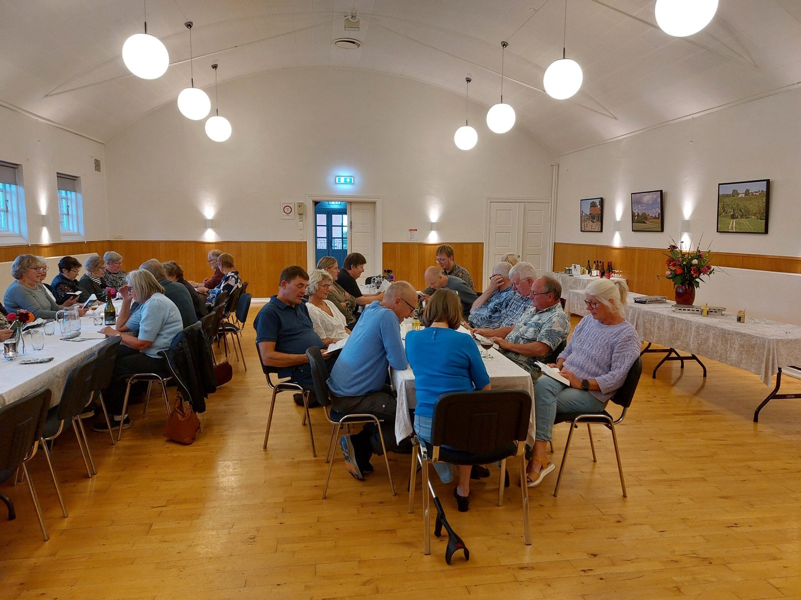 Inden maden blev serveret kunne Forsamlingshuset byde velkommen – selvfølgelig til aftenens pianist og de fremmødte deltagere; men også byde særligt velkommen til flere nytilflyttede. Det er dejligt at se, at vore nye naboer gerne vil deltage i landsbylivet.
