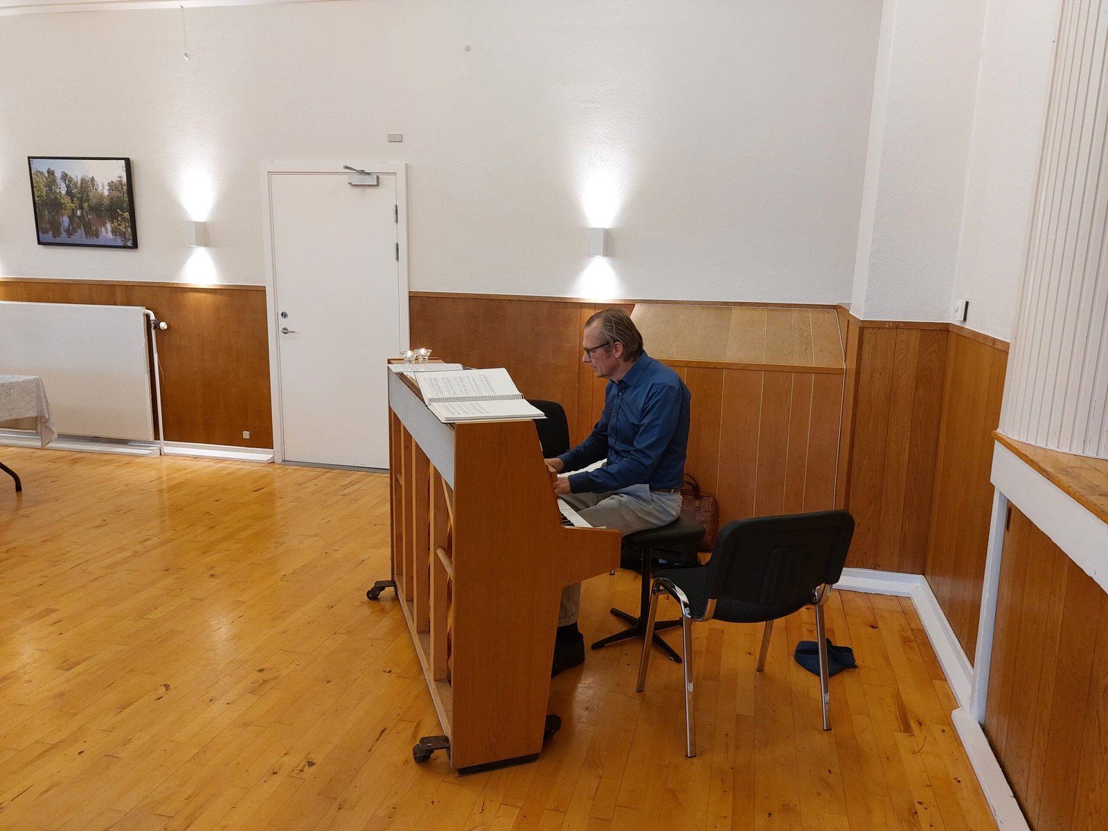 André havde lovet at spille til sangbogsindvielsen, så sangen virkelig kunne løfte sig, så efter maden sang vi – hver med vort næb og med stor indlevelse – de sange, André havde valgt.