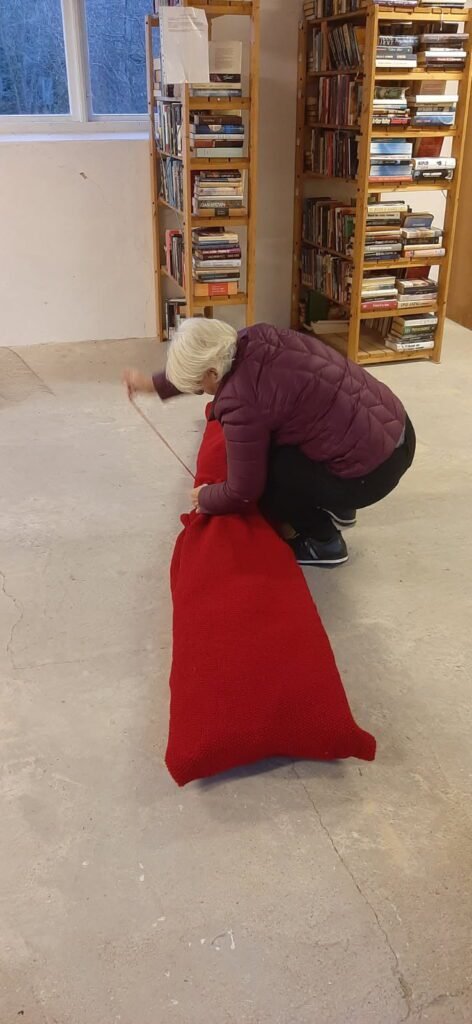 Billeder fra forarbejdet med ophængning af sløjfen - der er nogen meter strik at få styr på