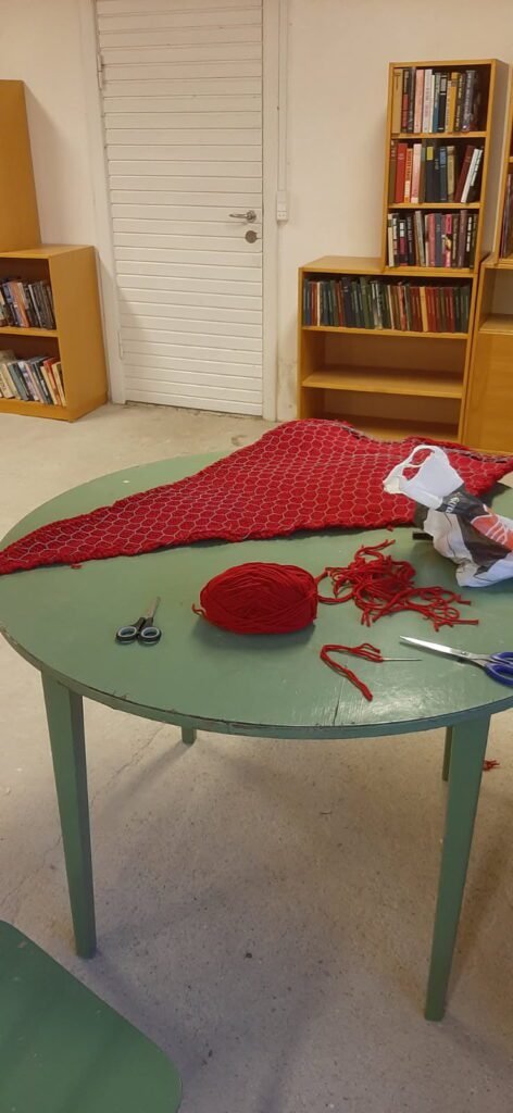 Der blev brugt 6450 meter garn på pinde nr. 4-5, og sløjfen endte med at måle12 meter og den er ca. 40 cm bred.